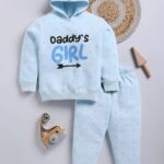 Celebrate the special bond with this charming Tinyo Girls “Daddy’s Girl” Hoodie Set. This soft blue coordinate set features a sweet all-over polka dot pattern and a bold central graphic on the sweatshirt that reads “Daddy’s GIRL” with a playful arrow accent. Crafted from premium fleece fabric, this set is designed to provide cozy seasonal warmth and a gentle feel against delicate skin. The functional hood and ribbed cuffs provide extra protection from the chill, making it a stylish and heartwarming choice for casual western wear.