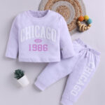 Keep your little one cozy and stylish with this Girls Printed Clothing Set. Made from soft cotton blend fabric, the lavender printed sweatshirt features a round neck and long sleeves, paired with matching printed joggers with a drawstring closure for a comfortable fit.
