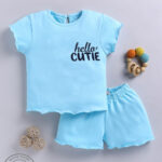 Dress your little one in fun and comfortable style with the Tinyo Typography Printed Pure Cotton Top & Shorts Set for girls. This set includes a turquoise blue typography printed top with a round neckline, short regular sleeves, regular length, and back button closure. It is paired with matching turquoise blue solid shorts featuring an elasticated drawstring closure. Made from pure cotton, the set is soft, breathable, and easy to care for with machine wash.