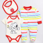 TINYO Infant Boys 3-Pcs Peanuts Printed Cotton Baby Apparel Gift Set (Beige & Red, Pack of 2)