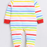 Beige and red striped sleepsuit with round neck, long sleeves, and attached footies