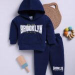 Keep your little champion warm and stylish with this Tinyo Infant Boys “Brooklyn” coordinate set. This classic Navy blue set features a bold chest graphic with “BROOKLYN” in large white varsity-style block letters. The design is accented by “NEW YORK” printed in yellow above and “CHAMPION” in yellow below the main text. The matching sweatpants complete the athletic look with a coordinated “BROOKLYN CHAMPION” graphic on the lower left leg. Crafted from premium fleece fabric, this set is designed to provide essential seasonal warmth and a soft, comfortable feel for infants. The hoodie is styled with a functional hood and a front kangaroo pocket, while the ribbed cuffs and hem ensure a secure and cozy fit.