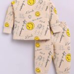 Charming beige coordinate set featuring a vibrant “Smiley World” all-over graphic print.