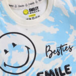• Blue and cream-coloured Smiley World printed t-shirt with round neck, short sleeves, and snap button closure