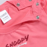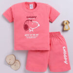 Dress your little one in comfortable everyday style with the Tinyo Infant Boys Snoopy Printed Cotton Blend T-Shirt & Shorts Set. This set includes a peach printed T-shirt with a round neckline and short regular sleeves with snap button, paired with matching peach printed shorts featuring elasticated slip-on closure. Crafted from cotton blend, the set offers a regular fit and is easy to care for with machine wash.
