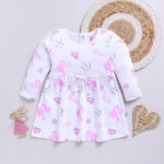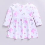 Tinyo infant girls Barbie print dress, Tinyo cotton flared dress, white and pink infant girls dress, breathable cotton baby dress, comfortable infant frock, stylish baby dress India, knee-length flared dress, bow detail dress for infants, machine washable baby dress, cute infant outfit, casual baby wear