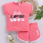 Tinyo infant girls set, Barbie printed top & shorts, cotton blend infant clothing set, round neck top for girls, extended short sleeve top, slip-on shorts for infants, machine washable infant outfit, Tinyo kids apparel