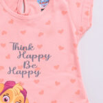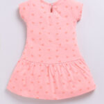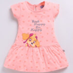Tinyo infant girls Paw Patrol print dress, Tinyo cotton A-line frock, peach infant girls dress, breathable cotton baby dress, comfortable infant frock, stylish baby dress India, knee-length flounce dress, machine washable baby dress, cute infant outfit, casual baby wear