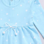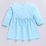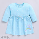 Tinyo infant girls printed dress, Tinyo cotton flared dress, blue infant girls dress, breathable cotton baby dress, comfortable infant frock, stylish baby dress India, knee-length flared dress, bow detail dress for infants, machine washable baby dress, cute infant outfit, casual baby wear