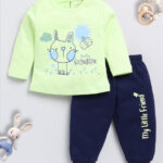 Tinyo infant girls set, green & navy blue printed T-shirt & joggers, pure cotton girls outfit, long sleeve T-shirt for infants, slip-on typography joggers, breathable cotton kids wear, machine washable infant clothing, Tinyo kids co-ord set