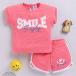 Dress your little one in comfortable everyday style with the Tinyo Typography Printed Pure Cotton Top & Shorts Set for infant girls. This set includes a coral typography printed top with a round neckline, short extended sleeves, regular length, and button closure. It is paired with matching coral shorts featuring side panelling and an elasticated slip-on closure. Designed in a regular fit and easy to care for with machine wash.