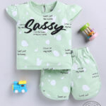 Keep your little one comfortable and stylish with this TINYO Infant Girls Typography Printed T-shirt with Shorts Set. Crafted from soft cotton blend fabric, it features a sea green typography printed T-shirt with a round neck, short sleeves, and button closure, paired with matching sea green typography printed shorts with slip-on closure. Perfect for playtime, outings, or casual wear.