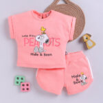Dress your little one in comfort and playful style with the Tinyo Peanuts Printed Cotton Top & Shorts Set for girls. This peach-coloured printed top features a round neckline and short sleeves, paired with matching peach-coloured printed shorts with a slip-on closure. Made from 100% cotton, the set is soft, breathable, and perfect for casual everyday wear. Easy to maintain with machine wash care as per label instructions.