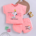 Tinyo girls set, Peanuts printed cotton top & shorts, round neck top for girls, slip-on shorts, lightweight cotton kids wear, machine washable kids outfit, Tinyo kids apparel