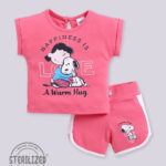 Tinyo Peanuts Printed Pure Cotton T-Shirt & Shorts Set For Girls (Coral Pink, Pack Of 1)