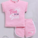 Dress your little one in comfort and playful style with the Tinyo Printed Typography Pure Cotton T-Shirt & Shorts Set for girls. This set includes a pink printed t-shirt with a round neckline and short rolled-up sleeves, paired with matching pink printed shorts featuring a slip-on closure. Crafted from pure cotton, the set is soft, breathable, and lightweight, perfect for everyday casual wear. Easy to maintain with machine wash care.
