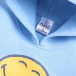 Tinyo boys hoodie and joggers set, Smiley World printed cotton blend clothing, medium blue casual wear for kids, soft and comfortable boys outfit, lightweight hoodie and joggers set, Tinyo kids apparel, daily wear boys clothing, playful printed hoodie set, comfortable kids casual wear