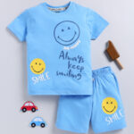 Tinyo boys set, Smiley World printed cotton t-shirt & shorts, round neck t-shirt for boys, slip-on shorts, lightweight cotton kids wear, machine washable kids outfit, Tinyo kids apparel