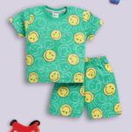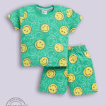 Dress your little one in comfort and playful style with the Tinyo Smiley World Printed Pure Cotton T-Shirt & Shorts Set for infant boys. This set includes a green printed t-shirt with a round neckline and short sleeves, paired with matching green printed shorts featuring a slip-on closure. Crafted from pure cotton, the set is soft, breathable, and lightweight, perfect for everyday casual wear. Easy to maintain with machine wash care.