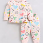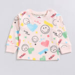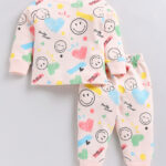Add comfort and playful style to your little one’s wardrobe with this Tinyo Smiley World Printed Pure Cotton T-shirt with Joggers Clothing Set for infant girls. This clothing set consists of a peach-coloured printed T-shirt with a round neck and long sleeves, paired with matching peach-coloured printed joggers featuring ribbed cuffs, an elasticated waistband, and a slip-on closure for easy wear.