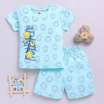 Dress your little one in everyday comfort and playful style with the Tinyo Smiley World Printed Pure Cotton T-shirt With Shorts for infant boys. This set features a Smiley World print, making it suitable for casual wear. Crafted from pure cotton, the fabric feels soft on delicate skin and ensures comfortable wear throughout the day. The T-shirt comes with a round neckline, short sleeves, and snap button closure, while the shorts feature a slip-on closure.