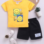 Tinyo Smiley World Printed Pure Cotton T-shirt With Shorts For Infant Boys (Yellow, Pack Of 1)