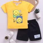 Tinyo Smiley World Printed Pure Cotton T-shirt With Shorts For Infant Boys (Yellow, Pack Of 1)