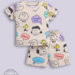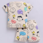 Dress your little one in comfort and playful style with the Tinyo Snoopy Printed Pure Cotton T-Shirt & Shorts Set for infant boys. This set includes a beige Snoopy printed t-shirt with a round neck, short sleeves, and snap button closure, paired with matching beige printed shorts featuring a slip-on closure. Crafted from pure cotton, the set is soft, breathable, and lightweight, making it ideal for everyday casual wear. Easy to maintain with machine wash care.