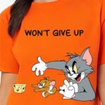 tom & jerry orange top women, cartoon graphic print boxy top, women’s casual cotton top, tom & jerry print medium top, boxy fit orange cartoon tee, women’s playful graphic top