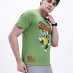 men’s Tom & Jerry printed t-shirt, green cartoon crew neck tee, regular fit short sleeve t-shirt, casual Tom & Jerry graphic top for men, soft Sinker fabric t-shirt, nostalgic cartoon print tee, medium length printed t-shirt, stylish men’s cartoon t-shirt, fun Tom & Jerry print t-shirt, everyday casual cartoon top for men.