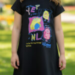 Let your little one step out in style with this Girls Graphic Printed A-Line Dress. Crafted from soft cotton fabric, this black dress features a round neck, short regular sleeves, and a straight hem for a comfortable and stylish fit. Designed in a knee-length silhouette, it ensures ease of movement and all-day comfort for everyday wear.
