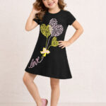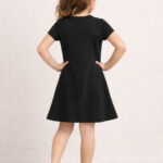 Let your little one step out in style with this Girls Graphic Printed A-Line Dress. Crafted from soft cotton fabric, this black dress features a round neck, short regular sleeves, and a straight hem for a comfortable and stylish fit. Designed in a knee-length silhouette, it ensures ease of movement and all-day comfort for everyday wear.