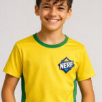 Add a sporty edge to your little one’s wardrobe with this Wildwoods Nerf Graphic Printed T-shirt for boys. This short-sleeve sports jersey comes in bright yellow with green trim along the sides and collar, featuring a dark emblem on the upper right chest. Crafted from soft and breathable polyester, it ensures all-day comfort for casual outings, playtime, or energetic activities.