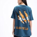 women garfield oversized t-shirt, teal longline cotton tee, humour comic back print t-shirt, cartoon graphic oversized top, drop-shoulder pure cotton t-shirt, relaxed fit casual wear women, garfield back printed oversized tee