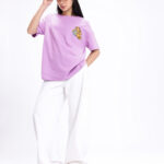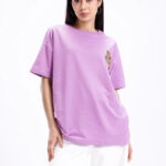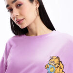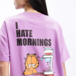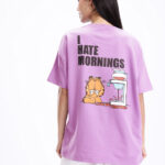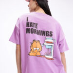 Add a playful touch to your casual wardrobe with this Garfield Printed Drop-Shoulder Sleeves Oversized T-shirt for women. Featuring a fun humour and comic-inspired Garfield print on the back, this purple and black tee brings out a cool and quirky vibe. Made from soft knitted cotton, it offers ultimate comfort and breathability for all-day wear. The oversized fit, round neckline, and drop-shoulder sleeves give it a relaxed and trendy appeal — perfect for pairing with joggers, shorts, or denim for an effortlessly stylish look.
